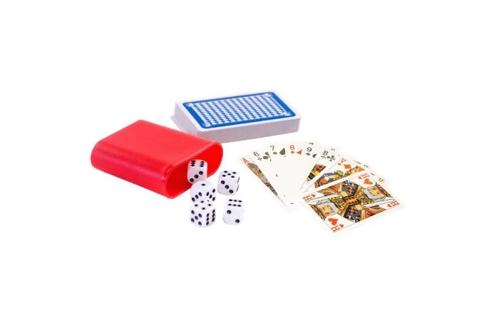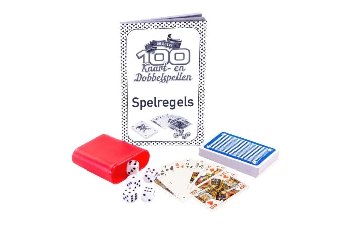 - instructieboekje met uitgebreide uitleg voor 100 kaart- en dobbelspellen