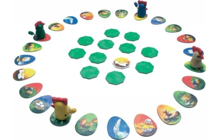 Je krijgt een kip met 1 veer in zijn staart. Alle kippen staan op gelijke afstand van elkaar op een cirkel van looptegels. Als je aan de beurt bent, draai je een van de tegels in de cirkel om. Is het plaatje erop hetzelfde als de afbeelding op de volgende looptegel, dan mag je een stapje verder. En, je mag meteen nog een keer!
