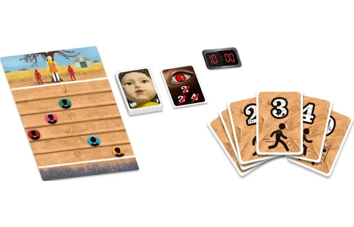 Red Light Green Light – In dit spel moet je jouw teamleden naar de overkant van het speelbord laten lopen. Het cijfer op de kaart die je per beurt speelt, geeft aan hoeveel stappen je teamleden mogen doen. Draai daarna een kaart van de gevreesde pop om. Als die kaart hetzelfde cijfer laat zien, wordt jouw voorste teamlid uitgeschakeld.