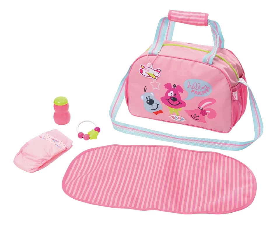 Ga op stap met deze hippe BABY born luiertas! Met deze tas heb je altijd alles bij de hand om je pop een schone luier aan te doen. De tas heeft nog ruimte genoeg om een extra outfit of jasje voor je pop mee te nemen voor onderweg. Deze mooie tas wordt geleverd met een verzorgingsmatje, een luier, een babypoederbus en een rammelaar voor je pop.
