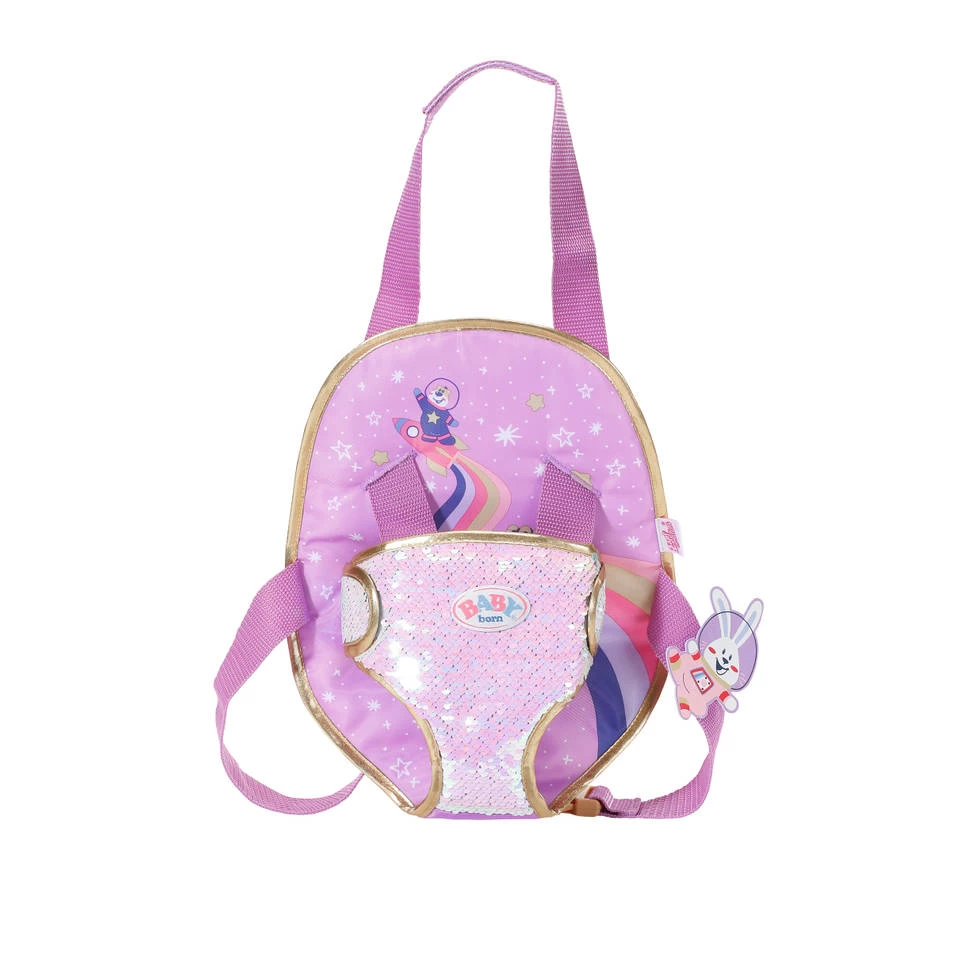 BABY born voelt zich als een prinses in haar superschattige draagzak. BABY born vindt dat een draagzak de moderne versie van een draagstoel is. Deze trendy draagzak is uitgevoerd in een leuk verjaardagsthema, wat het setje extra elegant maakt. De zak is bedekt met lovertjes die van kleur veranderen en is voorzien van sterren en kosmische motieven op het rugkussen. Benno het konijn gaat, als astronaut, ook altijd mee op excursie. Hij staat op de verstelbare riempjes waardoor de draagzak kan worden aangepast aan kinderen van verschillende lengten.
