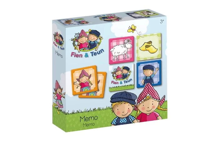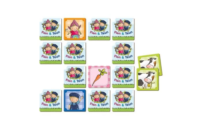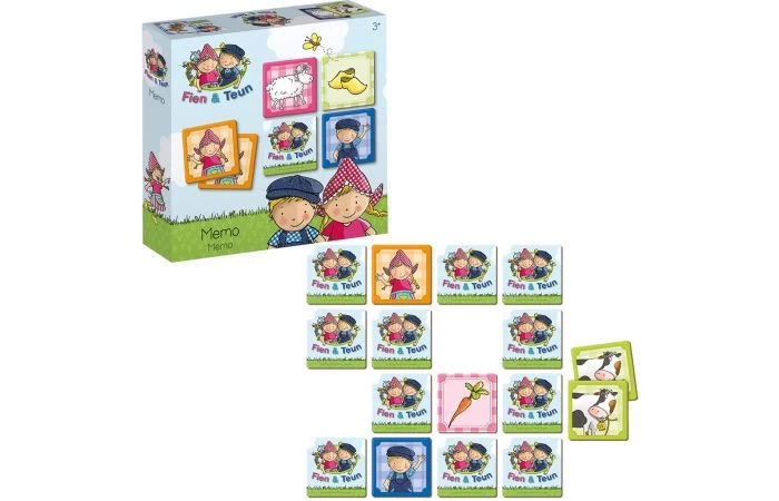 Memo is bij iedereen bekend en kinderen zijn er helemaal dol op. Voor dit memospel zijn afbeeldingen gebruikt uit de serie Fien & Teun en dat maakt het voor kinderen heel herkenbaar en extra leuk. Draai telkens twee kaartjes om en probeer te onthouden waar twee dezelfde exemplaren liggen. Wie uiteindelijk de meeste paren heeft wint. Op de kaartjes staan afbeeldingen van Fien, Teun, boerderijdieren, fruit en nog veel meer. Dit memospel bestaat uit 40 kaartjes van zeer stevig karton. Voor kleinere kinderen is het verstandig eerst met een beperkt aantal kaartjes te beginnen. Geschikt voor kinderen vanaf 3 jaar.