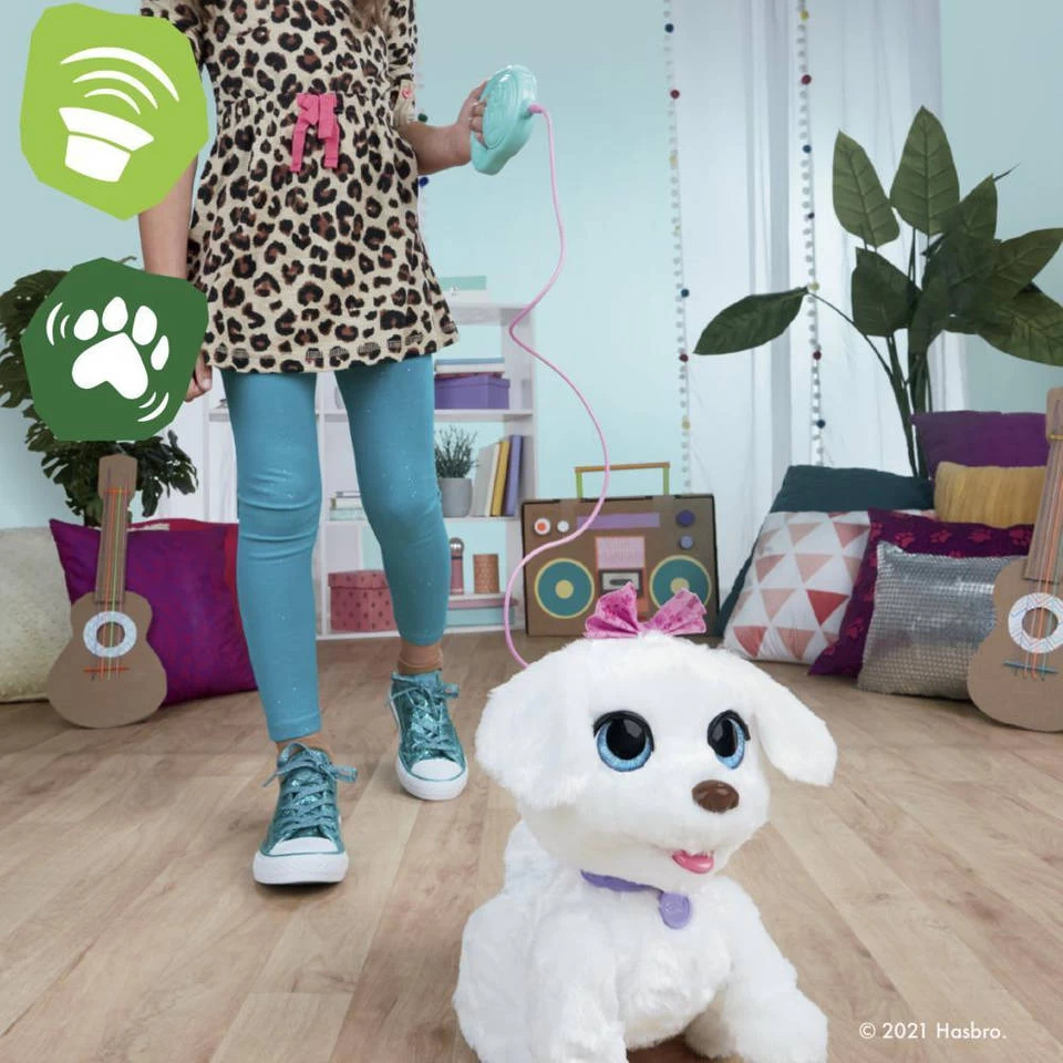 Maak er met deze FurReal GoGo dansende pup een leuk dansfeestje van of ga samen wandelen. De riem wordt geleverd met knopjes om de pup allerlei leuke dingen te laten doen. Er is bijvoorbeeld een knop waardoor ze gaat dansen terwijl ze vijf verschillende liedjes speelt. Er is ook een knop die je kunt indrukken om haar te laten lopen. Waar ga jij vandaag heen met jouw lieve pup?