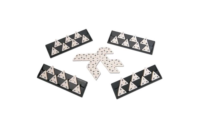 Het originele Triominos spel! Zoek je kansen, leg ze snel aan en scoor zo veel mogelijk punten. Bij dit spel gaat het niet alleen om inzicht maar ook om tactisch spelen: sommige aangelegde figuren leveren je namelijk ook veel punten op! Het spel begint door een willekeurige steen op tafel te leggen en de speler scoort ook de waarde van deze steen. Iedere speler probeert tijdens zijn beurt één van zijn Triominos stenen passend aan te leggen aan alle kanten van alle stenen die reeds op tafel liggen. Het spel eindigt wanneer een speler alle stenen van zijn plankje heeft gespeeld. De winnaar is uiteindelijk degene met de meeste punten. Voor 2 tot 4 spelers vanaf 6 jaar.