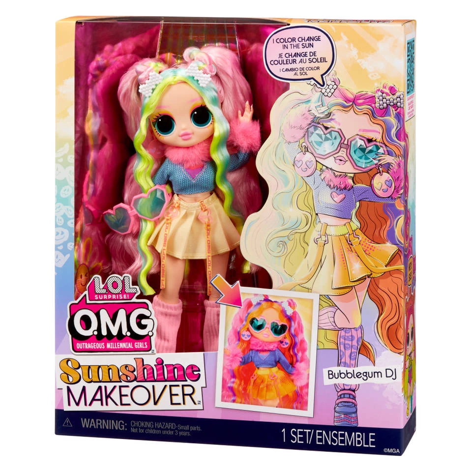 - L.O.L. Surprise! O.M.G. Sunshine Makeover-modepop Bubblegum DJ houdt niet alleen van een mix van kleurrijke mode, maar vindt het ook geweldig om haar eigen muziek te mixen.