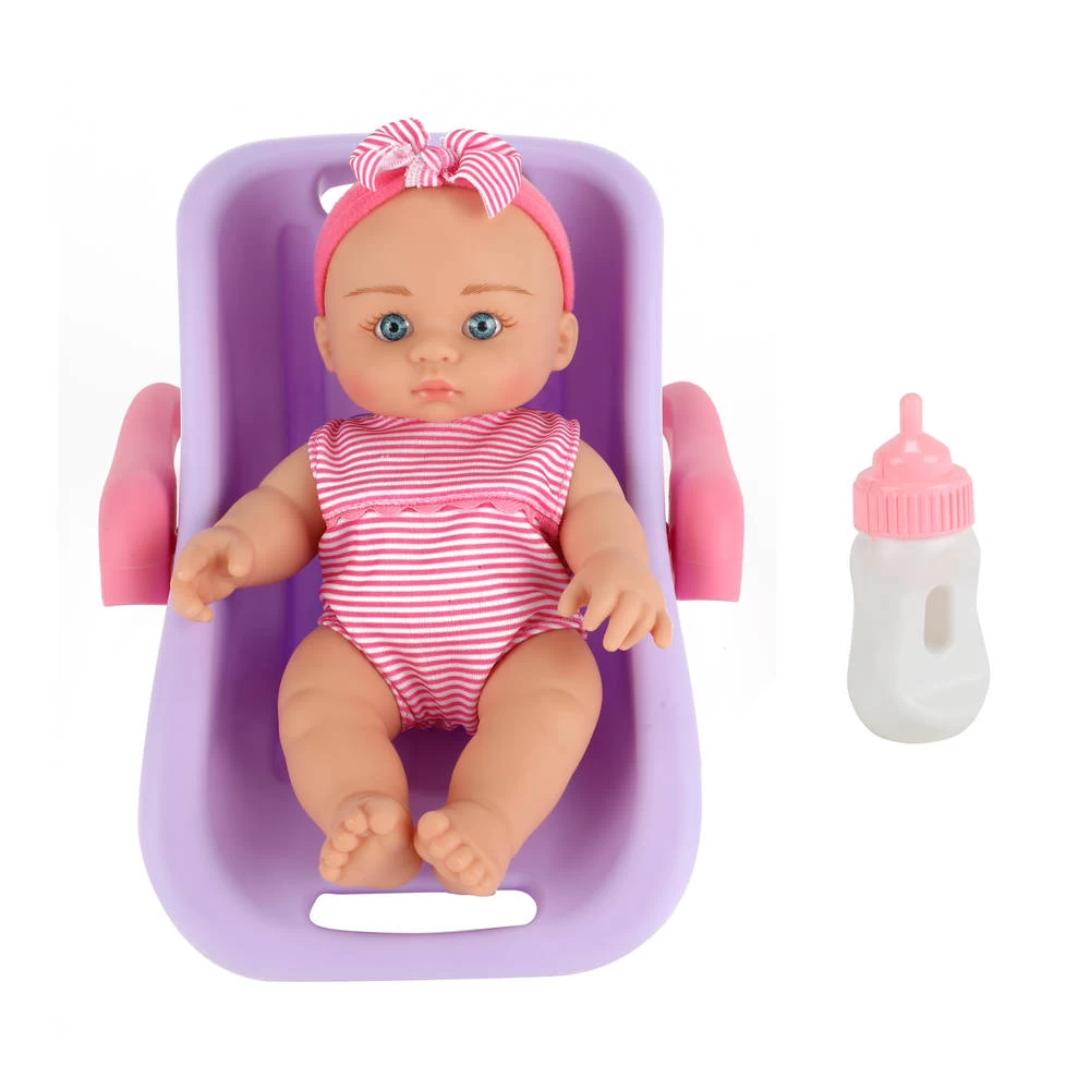 Zet deze lieve babypop in haar draagstoel en neem haar overal mee naartoe. Vergeet haar flesje niet voor wanneer ze honger heeft.