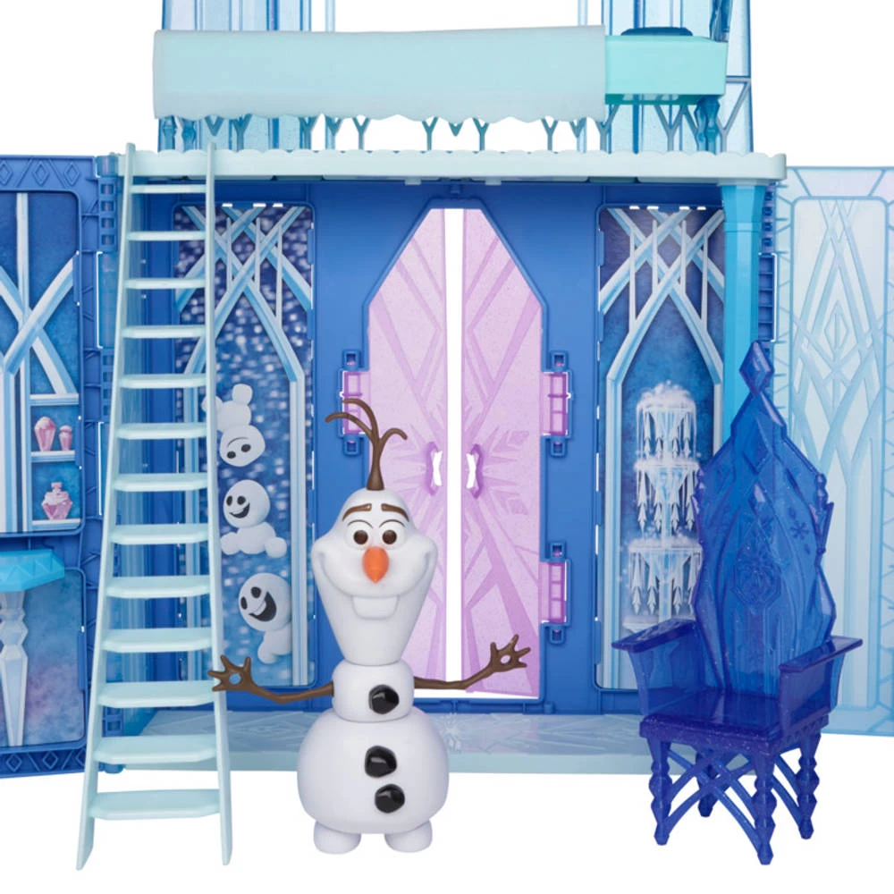 - Het paleis is uitgerust met een handvat en wordt geleverd met een troon, een bed, een deken, twee stoelen, snacks, make-upaccessoires en een schattig poppetje van Olaf.