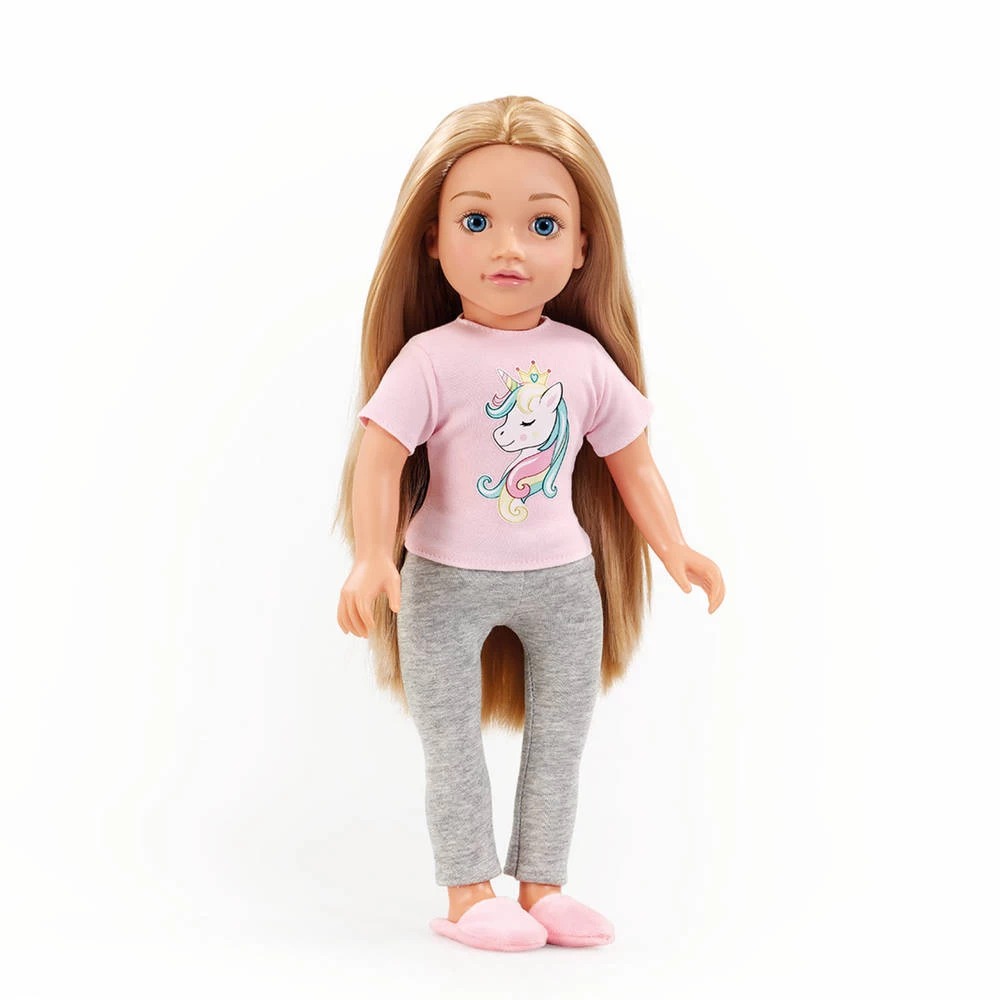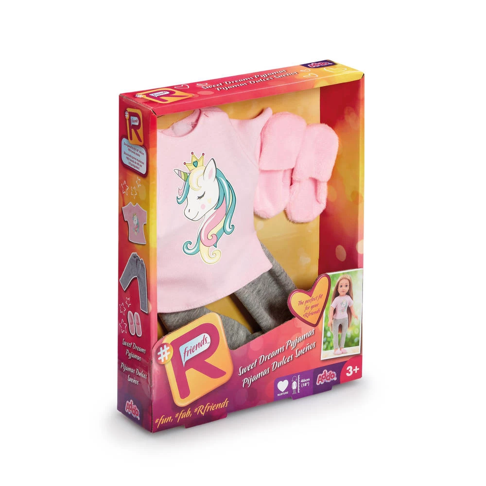 Organiseer een pyjamafeestje met al je #Rfriends modepoppen met deze leuke pyjama kledingset! Deze set bevat een pyjamatop met eenhoornprint, een jersey pyjamabroekje en donzige pantoffels.