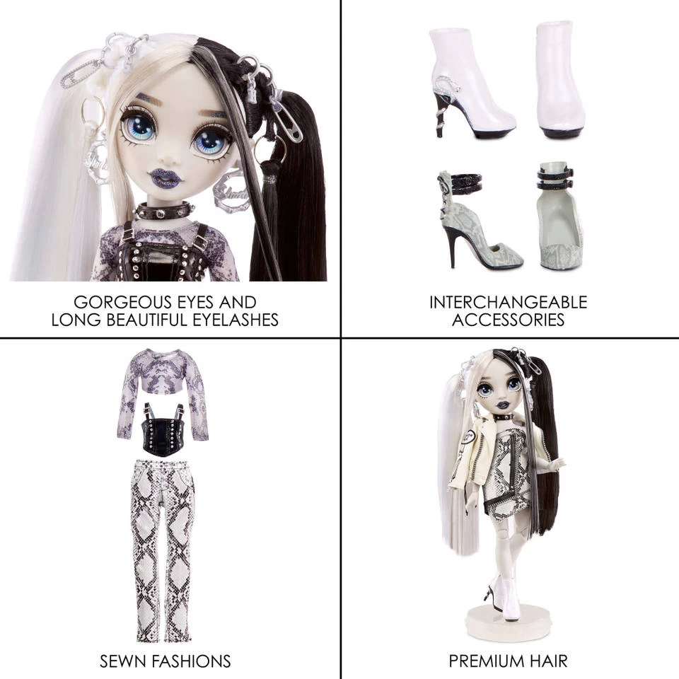 - Aangezien Shadow High de rivaliserende school is van Rainbow High, is de prachtige verpakking een weerspiegeling van Rainbow High, maar vind je de poppen helemaal aan de rechterkant en heeft het grijs de regenboogkleuren verdrongen. Geweldig om mee te spelen of cadeau te doen!