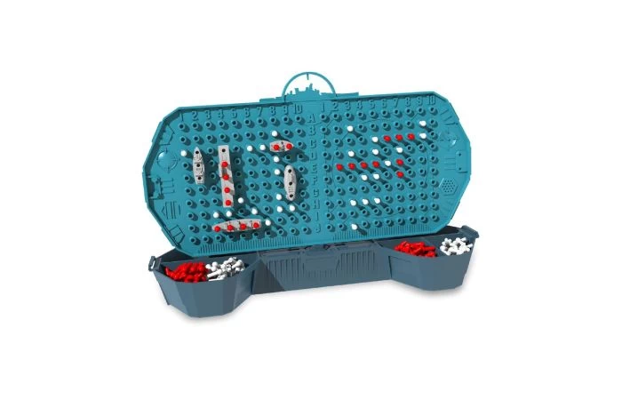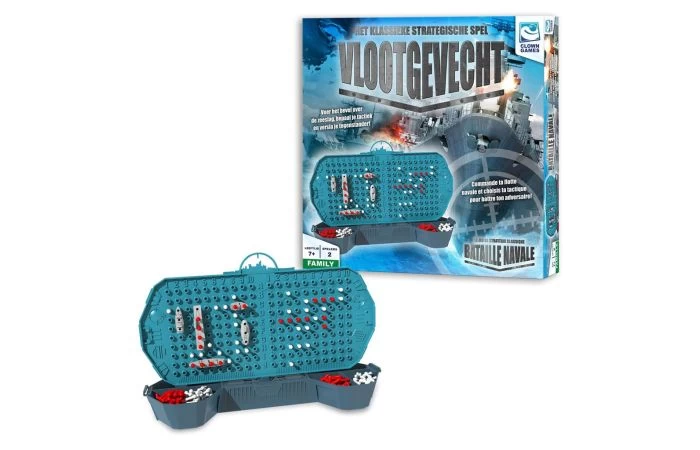 Zoek, schiet en win dit Clown Vlootgevecht spel! Kun jij de vloot van je tegenstander tot zinken brengen voordat al jouw schepen naar de haaien zijn? Beide spelers verdelen hun schepen op hun oceaanraster. Het verticale doelwitraster zorgt dat je elkaars schepen niet kunt zien! Blijf vuren en markeer je treffers met de rode pinnetjes. Gebruik de witte pinnetjes om bij te houden waar je miste, zodat je geen schoten verspilt. Als je logisch denkt en af en toe wat risico neemt, breng je de vijandelijke schepen tot zinken. Doe dit snel, want de vijand probeert hetzelfde met jouw vloot te doen! Plan je strategie en leid je troepen naar de overwinning! Geschikt voor twee spelers vanaf 7 jaar.